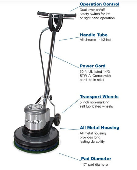 The 17" 1.5 hp Classic Floor Machine is powerful enough to handle tough jobs like grinding, but can also be used for more delicate jobs such as buffing finished floors. All metal handle housings, tube and trigger assemblies add to the long-lasting durability of the machine.