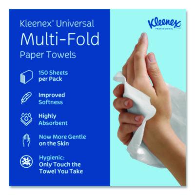 - 150 Sheets/Pack; 16 Packs of Kleenex® Universal Multifold Paper Towels/Case; 2,400 Sheets/Case; 9.2" x 9.4" sheets; White; fits universal multi-fold towel dispensers